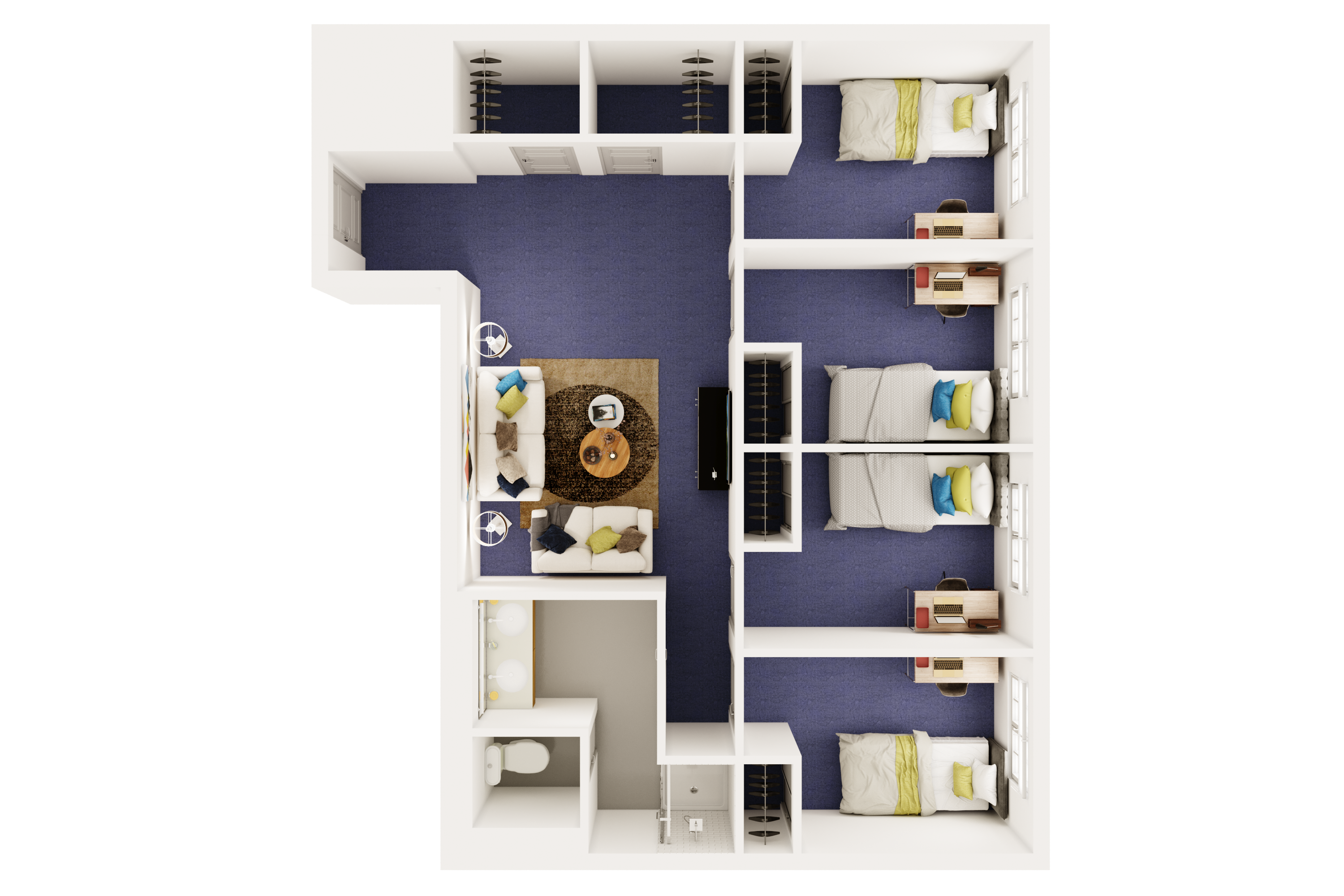Named for Arnold and Ellen Zetcher, Zetcher house consists of modern four and three-person suites, with a limited number of double suites – each having their own bathrooms. Modern four-person suites will have a shared living space. Each student will have a: XL twin bed frame and accompanying mattress; a three drawer dresser; and a computer desk and chair. A shower curtain is provided for the bathroom and the suite is carpeted. In the shared living space there is a couch, couch chair, coffee and side table provided.